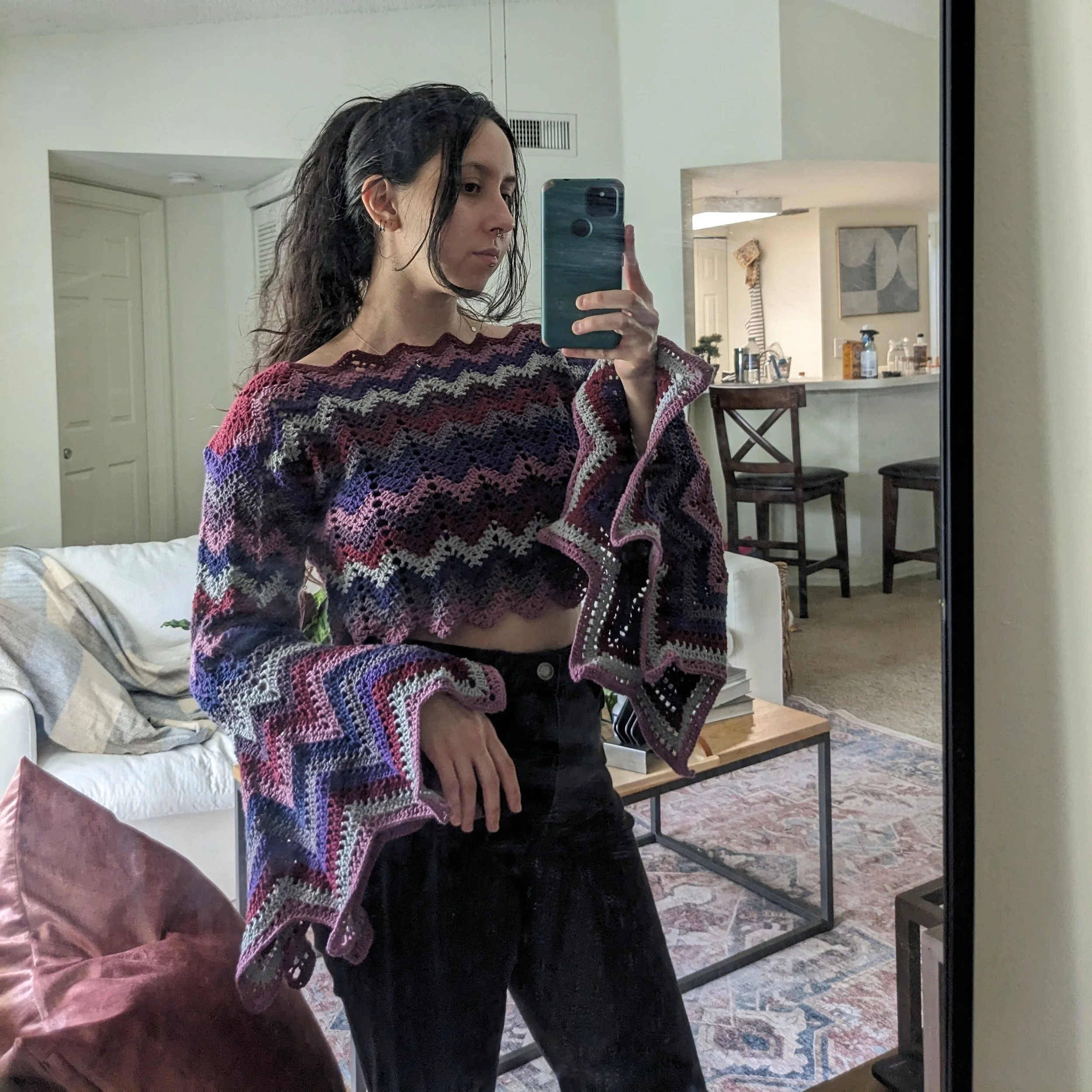 I moved to Knoxville in 2019, and started trying new things often. I got really into embroidery and cross-stitch, and about a year later I found inspiration while visiting my brother who had handmade items. I started crocheting a blanket on the drive home, and once arriving home I borrowed my housemate’s sewing machine, got some fabric, and whipped up a quilt. This inspiration was not going anywhere, so I found an old sewing machine to call my own and have been sewing and crocheting ever since!